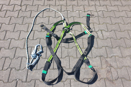 Hulpmiddelen bij hoogwerker zoals: aanhanger voor hoogwerker, veiligheidsharnas, rijplaten en pylonen